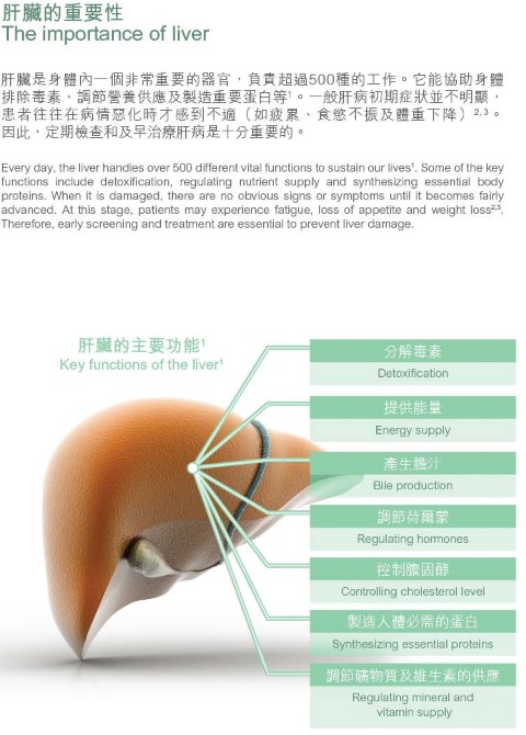 Every day, the liver handles over 500 different vital functions to sustain our life1. Some of the key functions include detoxification, regulating nutrient supply and synthesizing essential body proteins. When it is damaged, there are no obvious signs or symptoms until it becomes fairly advanced. At this stage, patients may experience fatigue, loss of appetite and weight loss2,3.Therefore, early screening and treatment is essential to prevent liver damage.